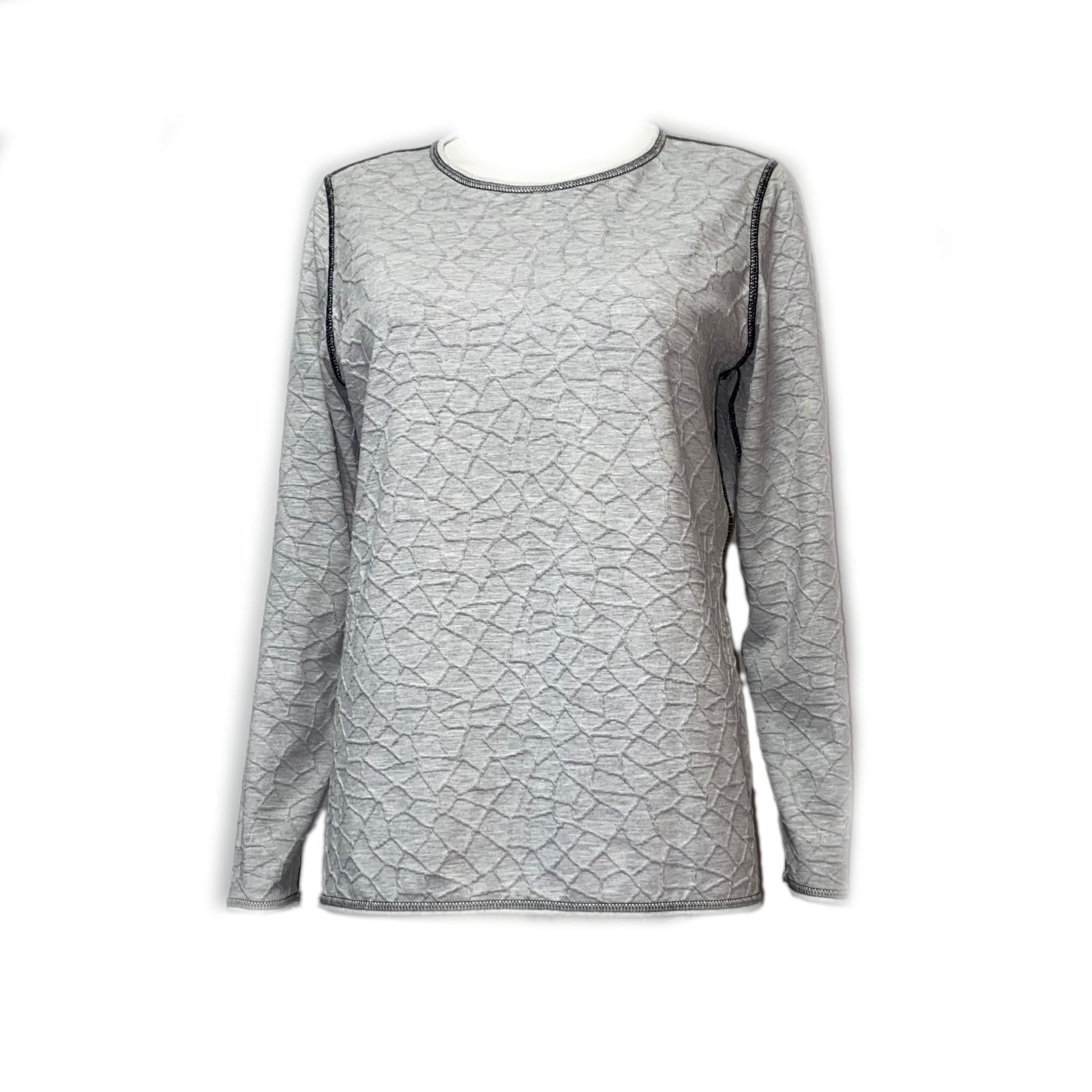 Wendepullover mit Rundhalsausschnitt. Eine Seite des Pullovers ist in grau - und beigetönen gemustert, die andere Seite ist einfarbig hellgrau mit einem Strukturmuster
