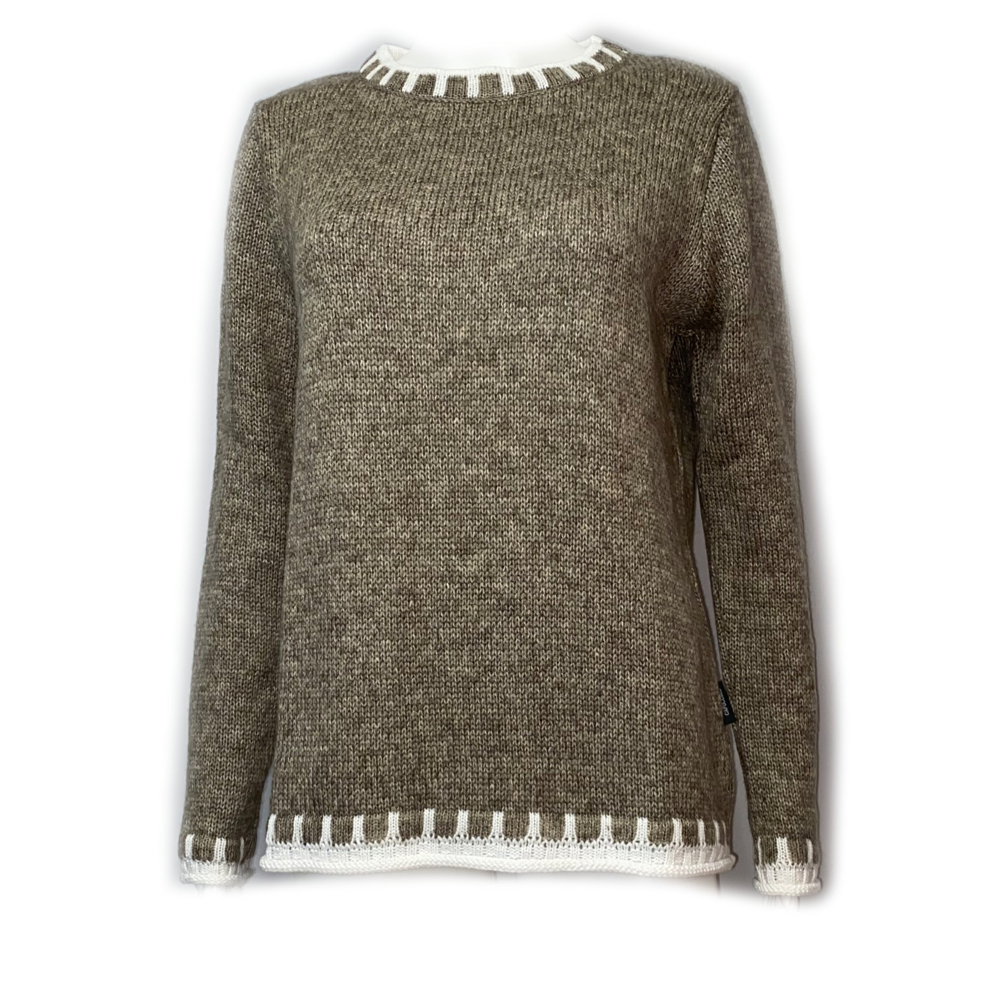 Strickpullover mit Rundhalsausschnitt. Alle Bündchen haben ein schönes, ins Auge stechendes Muster.