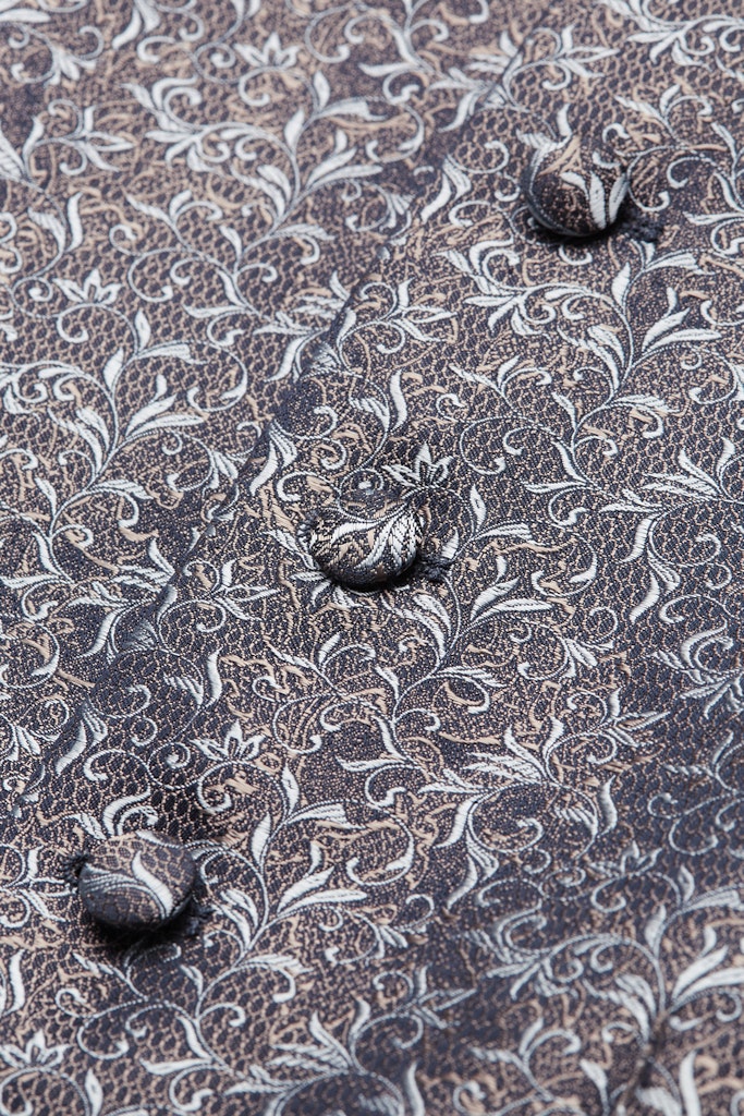 Das Farbenspiel der Emotionen. Die Weste "Lambert" ist ein meisterhaftes Bekenntnis zu Eleganz und Vielfalt. Das komplexe Rankenmuster vereint kunstvoll nuancierte Töne von Grau, Taubenblau, Hellbraun und Gold, die ein unschlagbares Kombinationswunder schaffen.