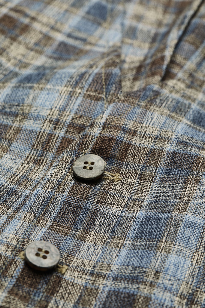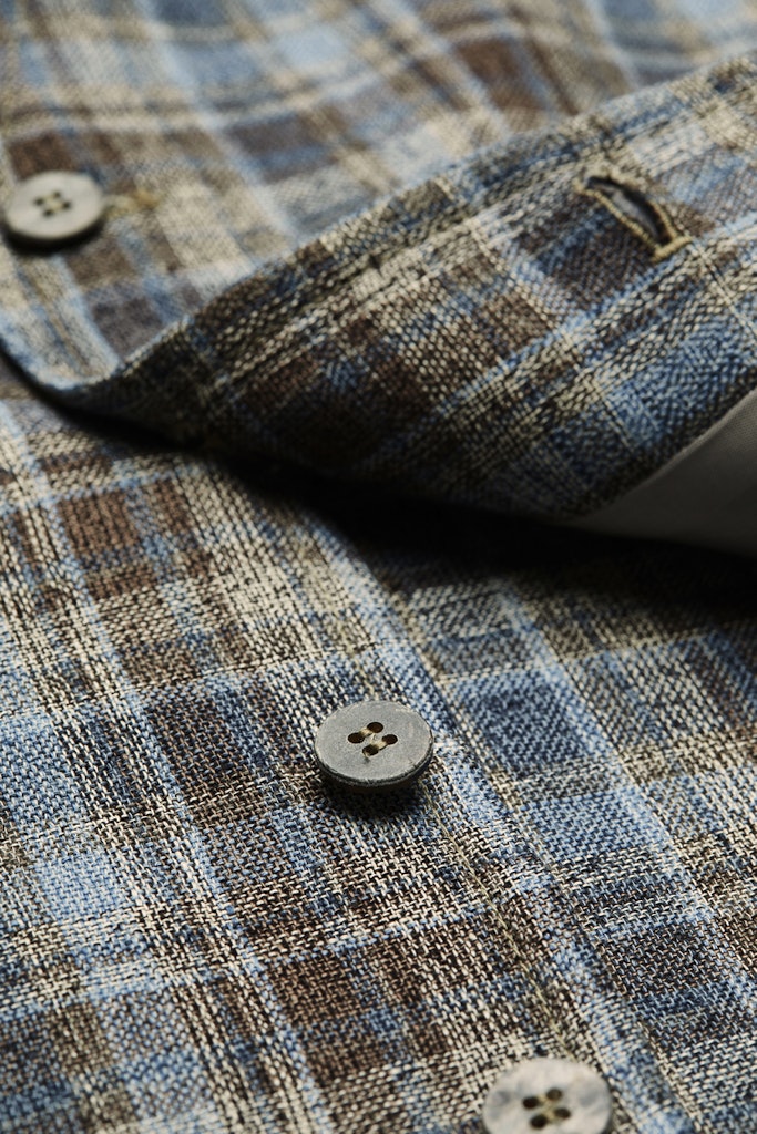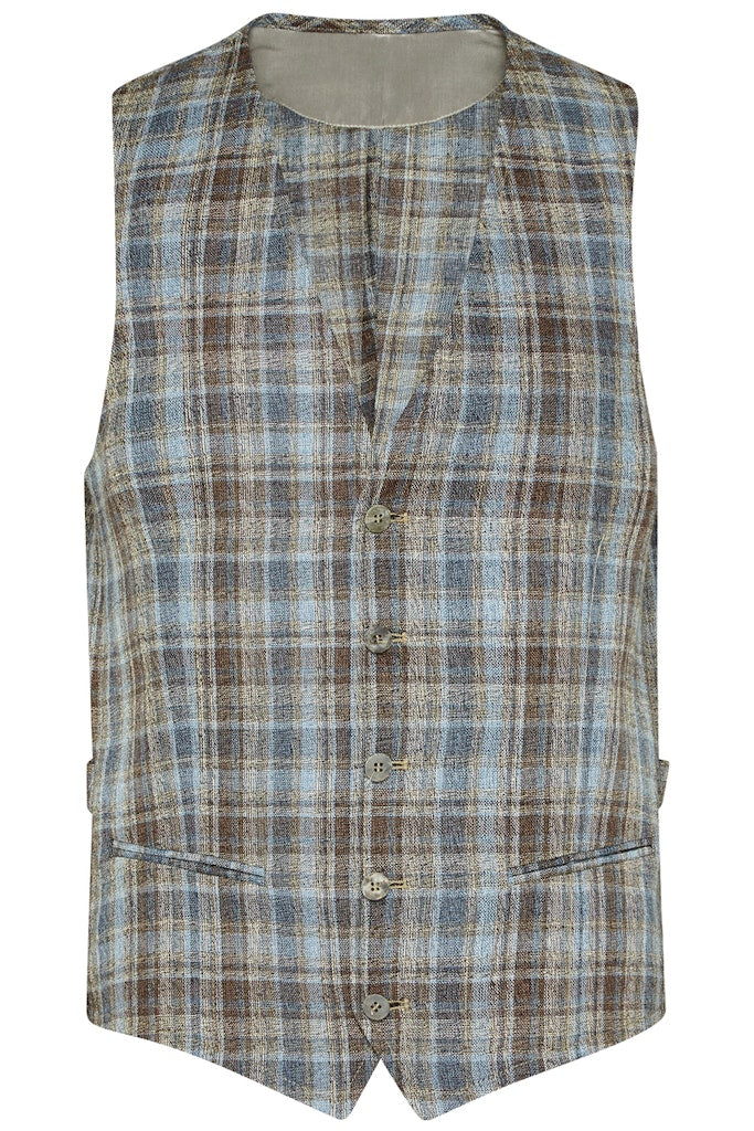 Die Weste Lucien in zartem, blaukariertem Dessin schenkt Ihrem Hochzeitsanzug eine frische, lebendige Note. Der rustikale Stoffrücken und die farblich abgestimmten Knöpfe unterstreichen die griffige Harmonie.