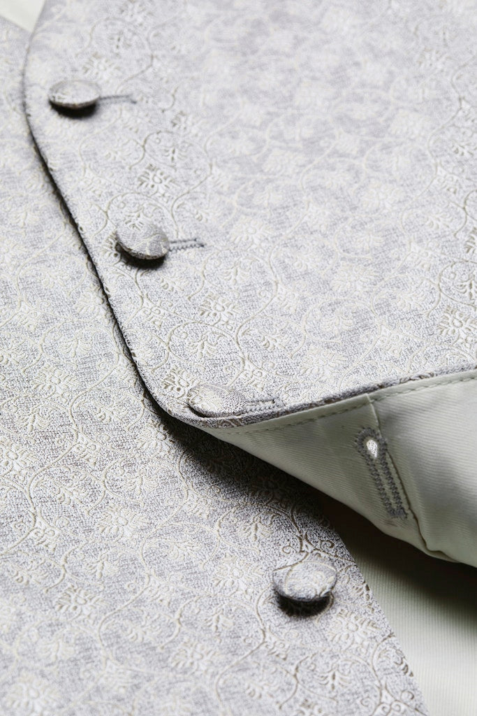 Das zarte, weißgoldene Brokatgewebe mit seinem feinen Ornamentmuster fängt das Licht ein und unterstreicht Ihren festlichen Auftritt. Mit liebevollen Details wie den stoffüberzogenen Knöpfen und den dezenten kleinen Taschen ist sie der Inbegriff von Stil. Der komfortable Futterrücken sorgt dafür, dass Sie sich den ganzen Tag – vom Ja-Wort bis zum letzten Tanz – rundum wohl und perfekt gekleidet fühlen. Für Momente, die bleiben.