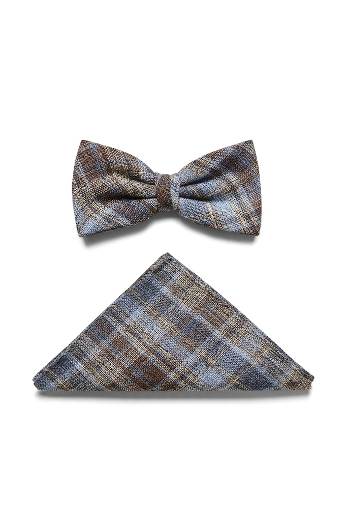 Dieses Set aus Fliege und Einstecktuch greift das charmante Blau-Karo der Weste auf und setzt einen fröhlichen, stilsicheren Akzent. Es ist das kleine, aber entscheidende Detail, das Ihren Look vollendet und die Augen Ihrer Liebsten strahlen lässt.