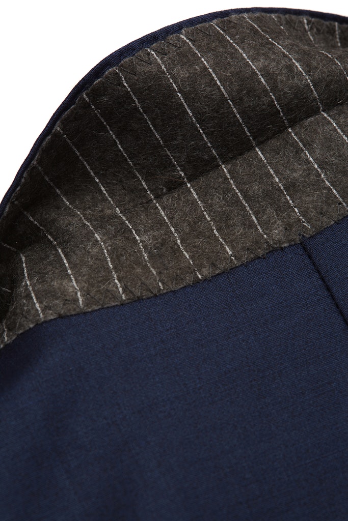 Mit seinem klassischen, figurbetonten Slim-Fit-Schnitt und dem 2-Knopf-Verschluss bietet dieses dunkelblaue Sakko eine souveräne Silhouette. Es besticht durch ein Spitzfasson-Revers und toniges AMF-Stitching, das die hochwertige Verarbeitung subtil unterstreicht.