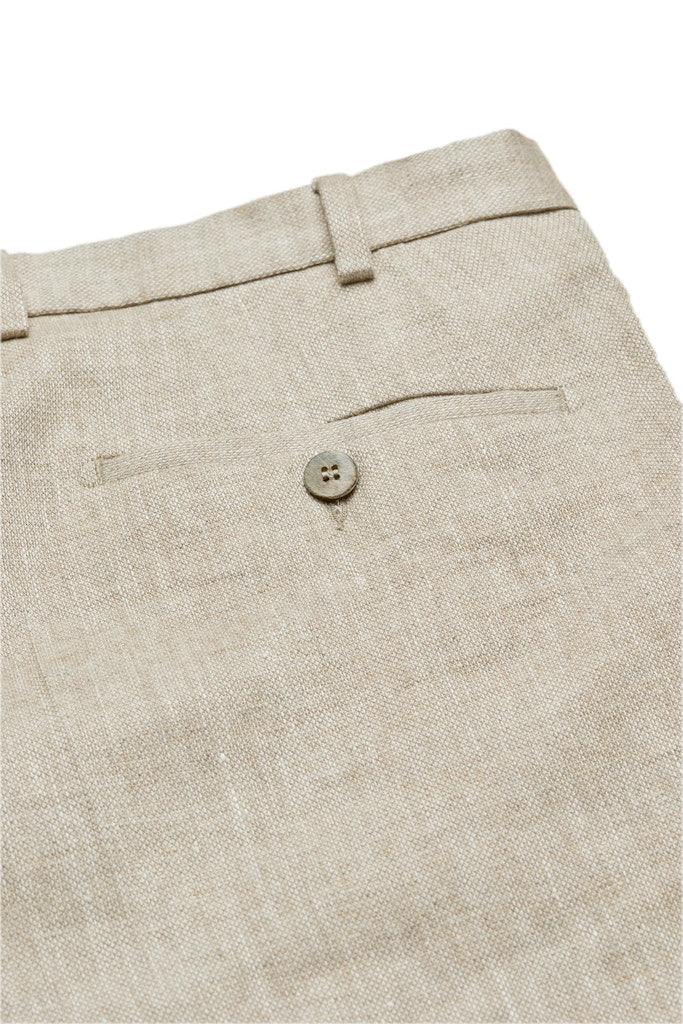 Ihr hoher Leinenanteil in hellem Beige fängt den entspannten, authentischen Vintage-Charme des Ensembles ein und garantiert gleichzeitig höchsten Tragekomfort, selbst wenn die Feier bis in die Morgenstunden dauert.