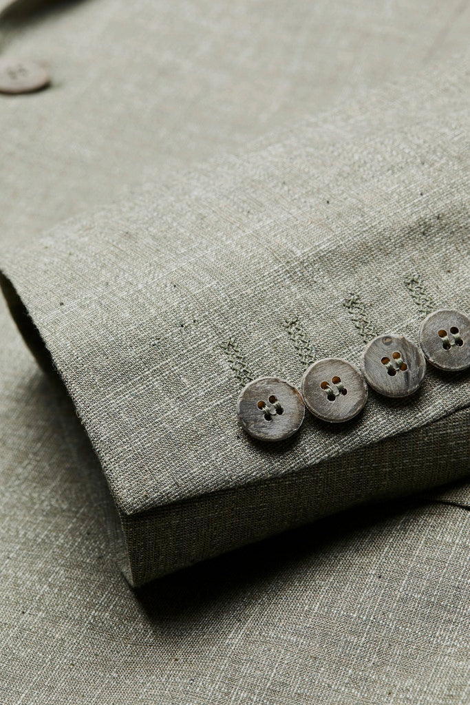 Salbei ist die Farbe des Neubeginns und des stillen Glücks. Mit zwei Rückenschlitzen für fließende Bewegungen ist dieses Sakko der perfekte Ausdruck für den Mann, der Tradition und sanfte Modernität liebt. Fühlen Sie sich geborgen und wunderschön.