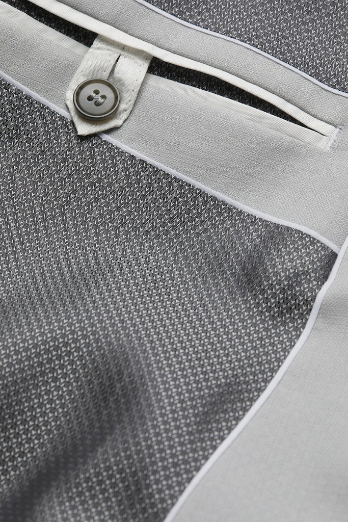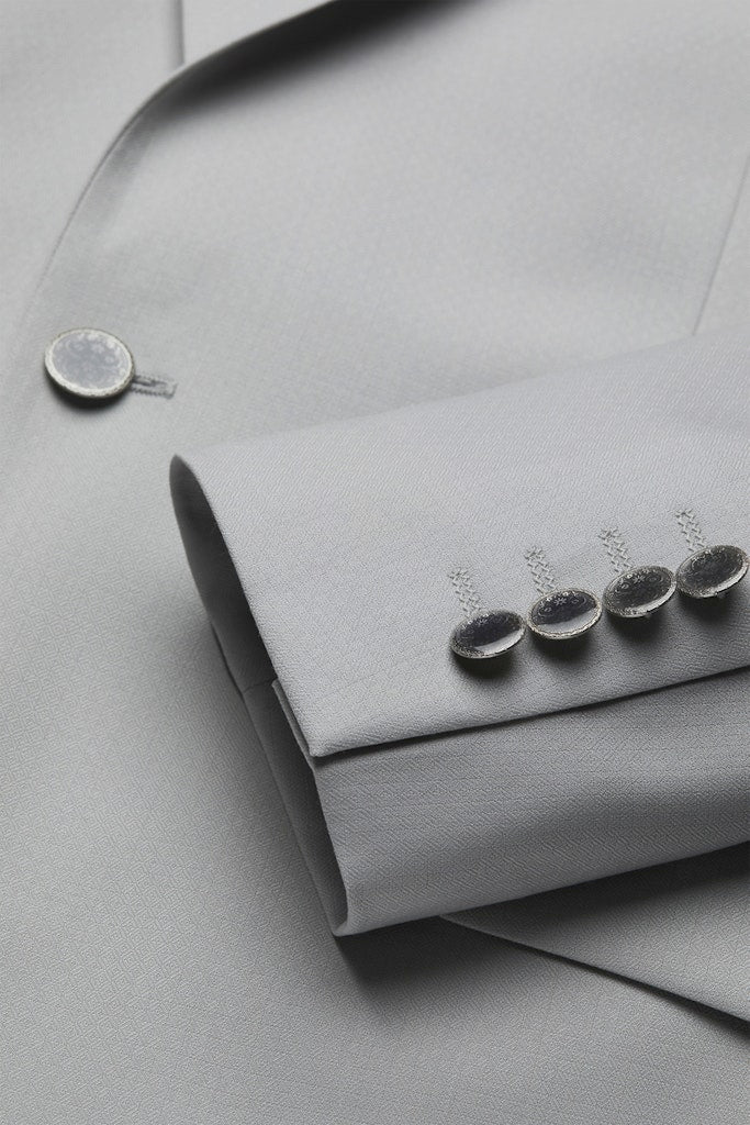 Dieses hellgraue Sakko aus reiner Schurwolle ist für die Momente gemacht, in denen du dich so leicht fühlen willst, wie du aussiehst. Dank der extrem feinen, fließenden Qualität schmiegt sich der Stoff fast schwerelos an, während die dezente, quadratische Struktur dem Look eine moderne Tiefe verleiht.