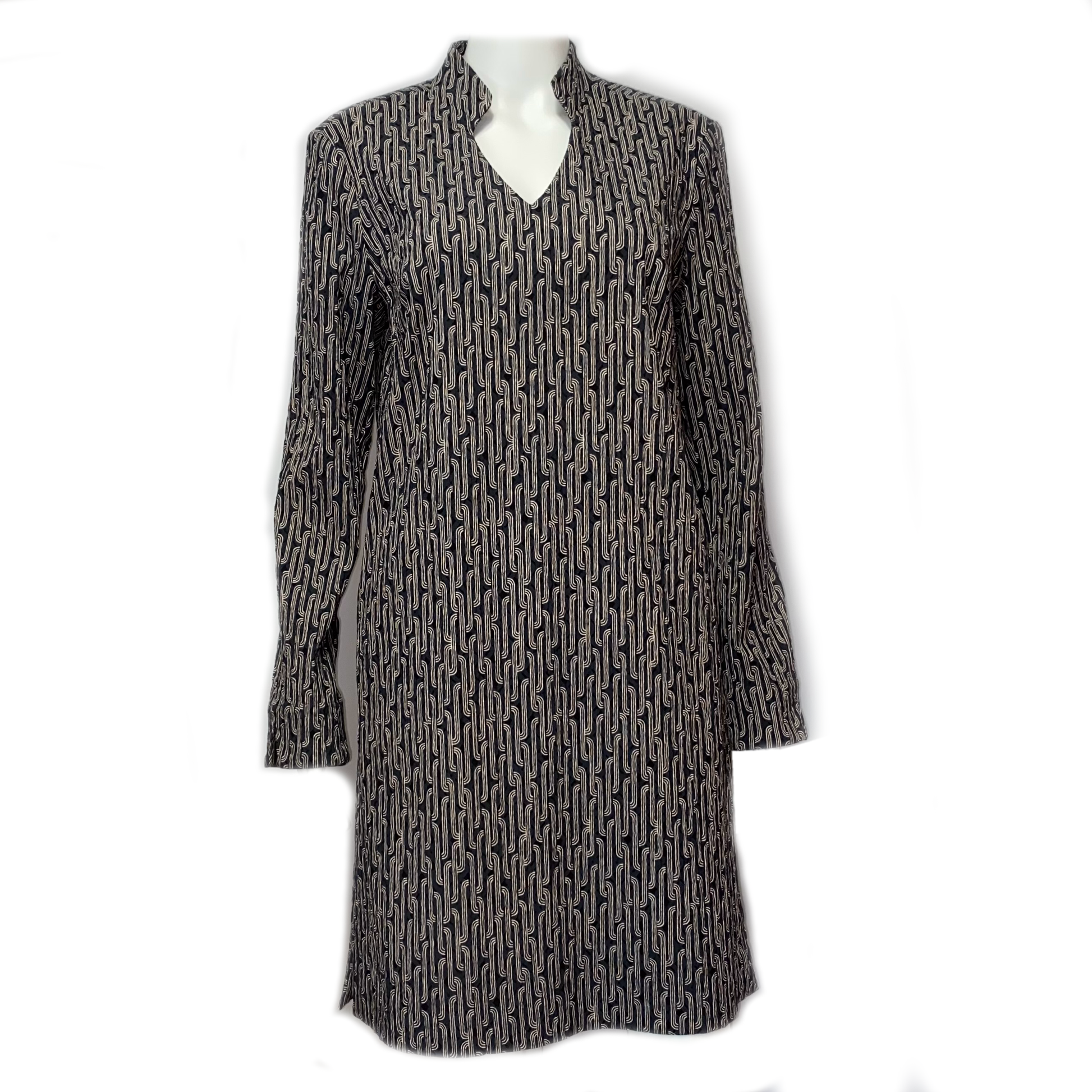 gemustertes Kleid mit V-Ausschnitt, Taschen und kleinen Schlitzen an der Seite